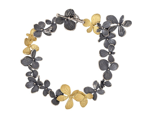 Inspired by the quiet beauty of the natural world, this John Iversen bracelet perfectly echos the shapes of tiny hydrangea flowers. Each flower is hand fabricated in oxidized sterling silver to create the individual links. Five bright 18K yellow gold flowers stand out along the composition for the perfect amount of contrast. It fastens with an oxidized sterling silver toggle clasp.