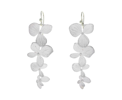 Intricately sculpted from a pale, white sterling silver is a cascade of four hydrangea flowers. Like art hanging from your ears, they are completely hand-fabricated by jewelry artist John Iversen.