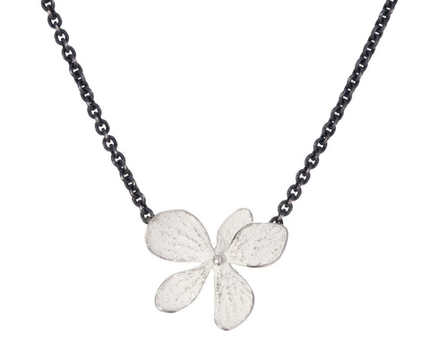 This John Iversen hydrangea flower pendant necklace possesses a quiet, restrained and earthy sophistication. A sterling silver hand-wrought hydrangea flower connects to two lengths of blackened silver chain. Stunning alone, but would also add an organically inspired element to any layered look