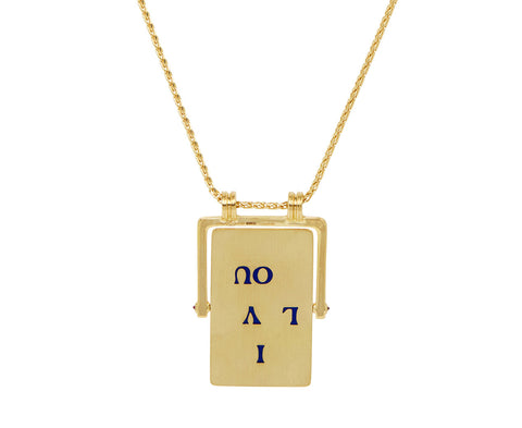 Begging for a closer look, this playful Marie Lichtenberg necklace has an understated yet straightforward sentiment. The matte 18K yellow gold rectangular pendant has navy lettering on both sides. When you spin the pendant around you can read the phrase 'I love you'. The scapular spins in the 18K yellow gold setting which hangs from the bottom of the 18K yellow gold spiga chain. Two tiny rubies accent the composition.