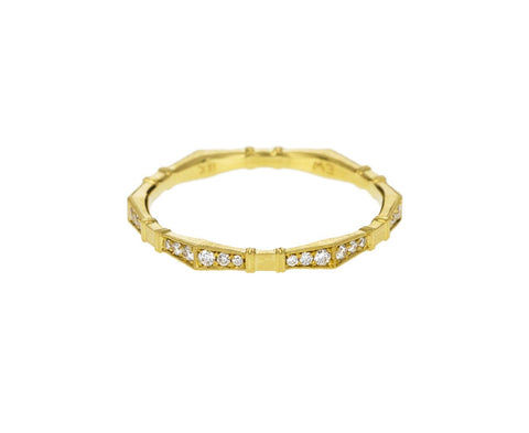 With a classic, detailed elegance and hint of sparkle, this finely handcrafted diamond band by Erika Winters exudes a stunning, modern and timeless style. The 18K yellow gold ring is set with six stations of sparkling diamonds with a subtle center apex. They are separated by plain gold segments to create the continuous band. Wear it to symbolize a wedding, anniversary or another special occasion. Pair it with one of Erika's diamond solitaires for a complete set.