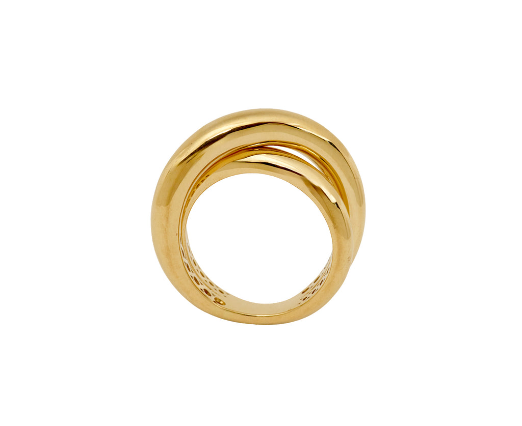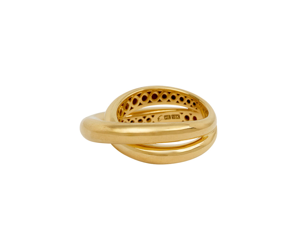 With its bold sophistication and brightly polished gold, this Engelbert ring is a three-dimensional take on the unmistakable infinity symbol. The tubular 18K yellow gold bands cross over one another in the front and connect back together at the back. The perfect way to add a pop of texture and sculptural design to any look.