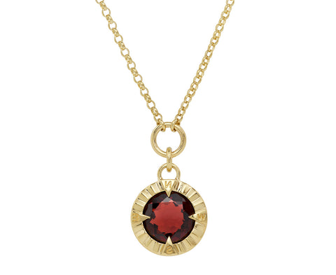 Stunning in its deep, juicy tone and modern design, this Foundrae necklace will add a sweetly symbolic vibe to any layered look. The round, faceted garnet is set at the center of the 18K yellow gold compass halo. It hangs from the center of the thin, adjustable 18K yellow gold chain.