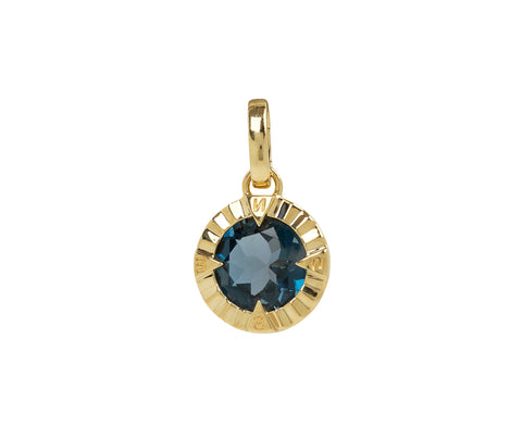 Subtle in scale and with a cool toned color, this Foundrae charm is meant to be added to any of your favorite chains. The round, faceted London blue topaz is set at the center of the 18K yellow gold compass halo. It hangs from the 18K yellow gold push gate clasp to be easily added to any look.
