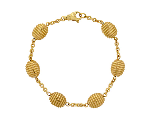 This weighty, textural Pamela Zamore bracelet is a modern version of the traditional gold chain. The oval, three-dimensional pendants have a linear, engraved surface and are set at evenly spaced intervals along the 18K yellow gold chain. It closes with an 18K yellow gold lobster clasp closure.