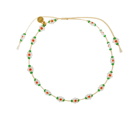 Fun and cheerful, this Tai bracelet is the perfect gift for yourself or a friend. The nylon cord is accented with tiny white daisy clusters. Festive and perfect for everyday, wear this bracelet to add a pop of color and playfulness.