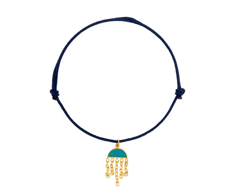 With its playful design and easy-to-wear style, this Marie-Hélène de Taillac charm bracelet is the perfect addition to any casual jewelry collection. Dangling from the adjustable navy blue nylon cord is a 22K yellow gold and turquoise enamel jellyfish charm with gold chain tentacles for added interest and movement. Wear it alone or add it to your personal layered bracelet collection for an unexpected element of whimsy.