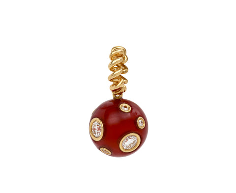 Vibrant in color and perfect in size, this Boochier pendant is the perfect way to add a hint of color to any look. The smooth, deep red carnelian is set with a front surface of shimmering, bezel set diamonds and hangs from the 18K yellow gold slinkee bale. It looks amazing whether worn alone or clustered with your other favorites.