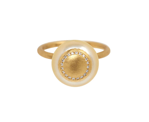 Elegant and distinctive, this Shinkai pearl ring exudes an earthy sophistication. The large, round South Sea pearl has a round, 18K yellow gold circle set at its center which is set with a halo of shimmering white diamonds. It's set at the center of the 18K yellow gold matte band and exudes a stunning, statement-making presence.