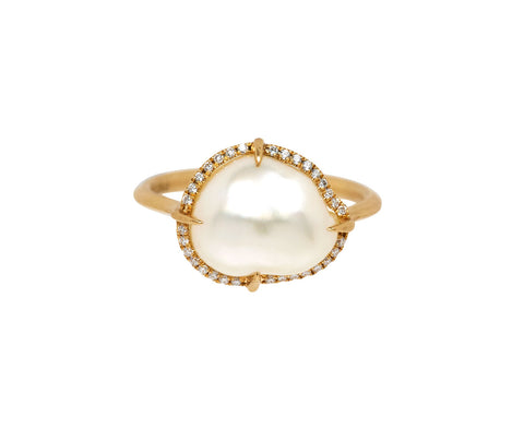This Shinkai ring is a stunning, modern and style-defining take on the traditional cocktail ring. The luminous white South Sea pearl is framed by a shimmering halo of white diamond pavé set in 18K yellow gold which follows the asymmetrical shape of the nature-made gem. It is centered on the thin, matte 18K yellow gold band.