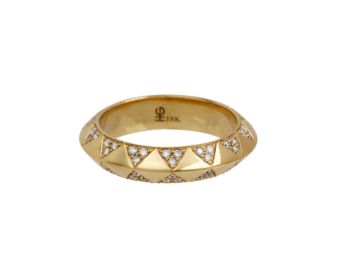 With its geometric, modern design, this Harwell Godfrey band is a perfect addition to a stacking collection or even a statement making alternative to the traditional wedding band. The knife edge 18K yellow gold ring has alternating triangles of polished 18K yellow gold and shimmering white diamonds.