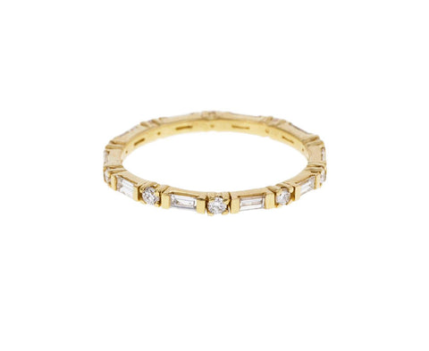 This stunning Jennie Kwon diamond ring is a modern interpretation of the classic diamond eternity ring. The alternating pattern of brilliant cut diamonds and diamond baguettes set in 14K yellow gold creates a striking texture and sparkle. Add it to a stacking collection, wear it as your wedding ring or pair it with one of Jennie's solitaires.