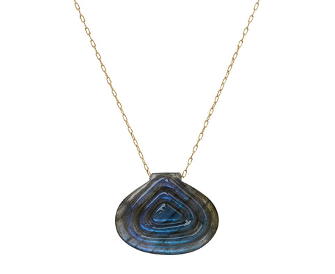 With its hand carved design and earthy shimmer, this TenThousandThings necklace makes a statement whether worn alone or layered with your other favorites. The softly triangular labradorite has a surface of carved lines and a tubular bale that allows the pendant to slide along the 10K yellow gold chain. It fastens with a hook and eye clasp closure.