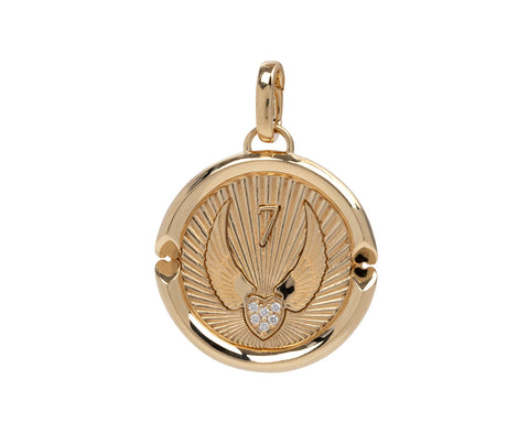 With its graphic design and warm toned gold, this Foundrae pendant will become your everyday talisman. Depicted on the front of the 18K yellow gold are the motifs from their True Love and Passion tenets. The 18K yellow gold medallion hangs from an 18K yellow gold push gate bale and is perfect hanging alone or alongside any of their other medallions.