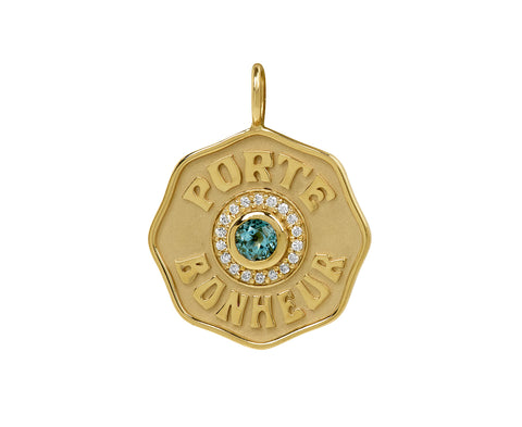 With its bohemian elegance and subtle color, this Marlo Laz pendant is perfect for the person with an understated sense of style. The large 14K yellow gold pendant has a shimmering blue aquamarine at its center surrounded by a halo of shimmering diamonds. The words porte bonheur are written in three dimensional letters for the perfect amount of texture. It hangs from the 14K yellow gold bale.