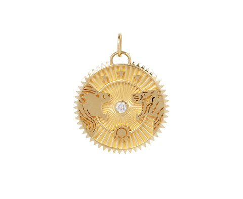 Bold, sophisticated, and statement making, this stunning Foundrae pendant exudes a timeless elegance. The 18K yellow gold medallion is carved with two silhouettes - one of a roaring lion and the other a tiger. The dueling felines are set on either side of the bezel set diamond. Three gold stars and one carved gold sun accent the composition. It hangs from an 18K yellow gold bale and looks perfect as an addition to any of Foundrae's heavier chains.