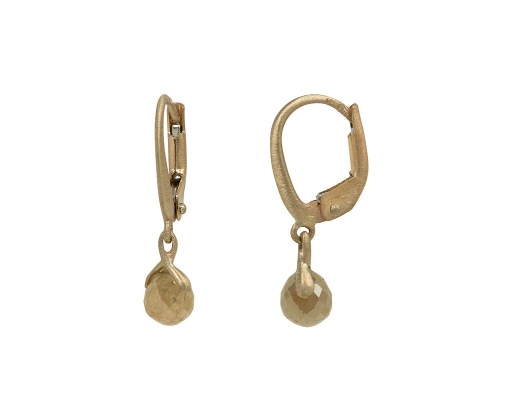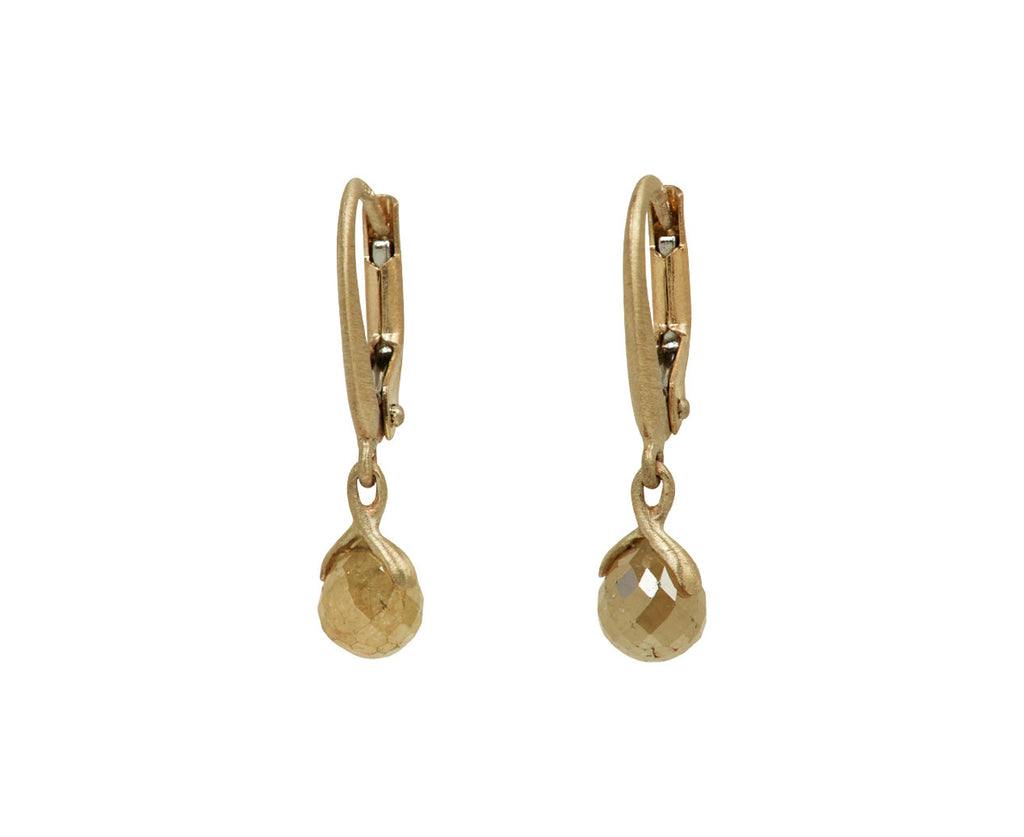 Captivating in their minimal design and earthy shimmer, these Anaconda diamond earrings exude a restrained elegance and luxury. The gray diamond briolettes are each capped with a meticulously hand-fabricated setting of 19K white gold and hang from the subtly engraved warm-toned 19K gold ear wires.