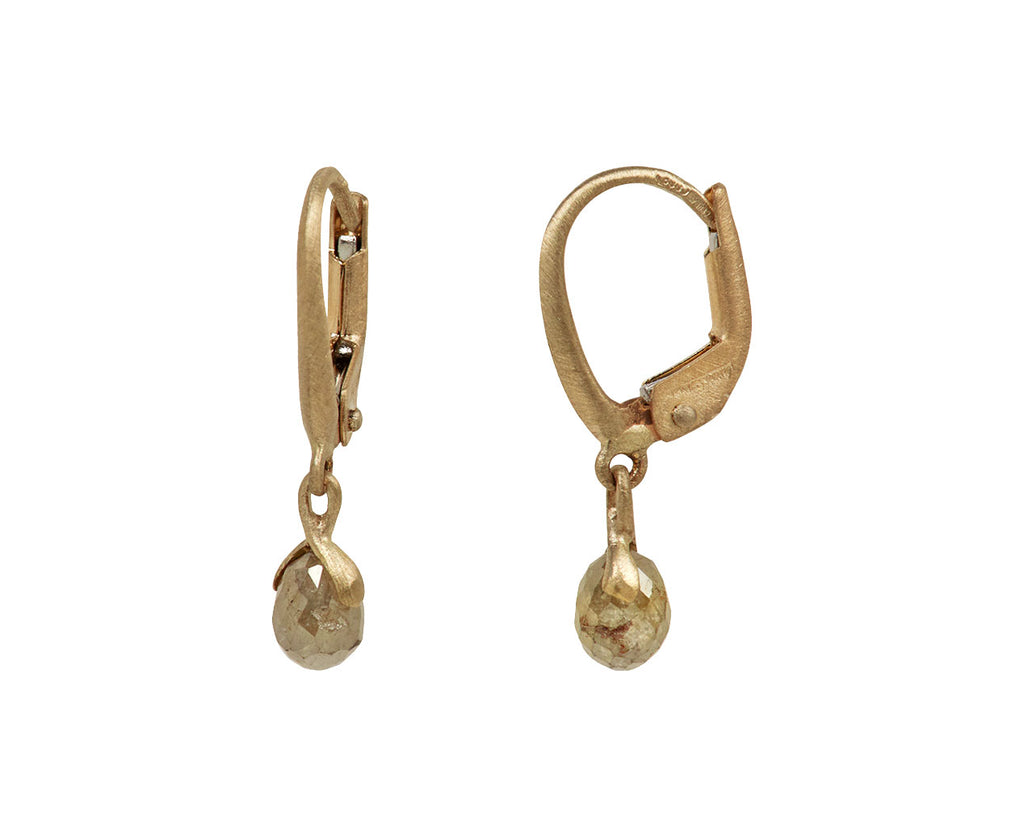 Captivating in their minimal design and earthy shimmer, these Anaconda diamond earrings exude a restrained elegance and luxury. The gray diamond briolettes are each capped with a meticulously hand-fabricated setting of 19K white gold and hang from the subtly engraved warm-toned 19K gold ear wires.