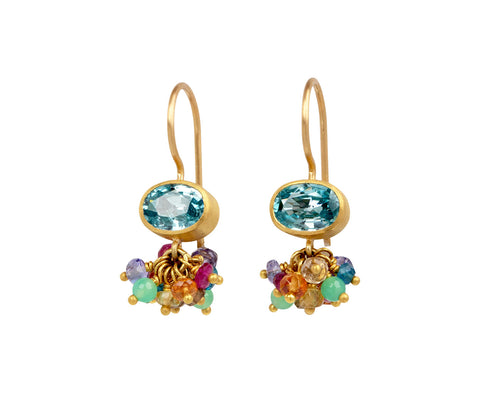 With a playful sophistication and rainbow color, these Mallary Marks earrings add an eye-catching element to any look. The oval, sky blue zircon are horizontally set in 22K yellow gold bezels. A dense cluster of tanzanite, mandarin garnet, apatite, chrysoprase, ruby and yellow sapphire anchor the composition as well as add a perfect hint of texture. They hang from 18K yellow gold ear wires.