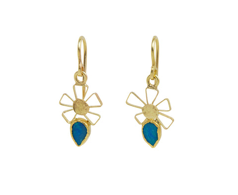 With a playful and airy elegance, these Judy Geib little starry earrings are a perfect balance of form and space. The 18K yellow gold stars connect to the 18K yellow gold ear wires. Pear shaped smooth opals anchor the composition to create a pair of earrings that can be worn with anything!