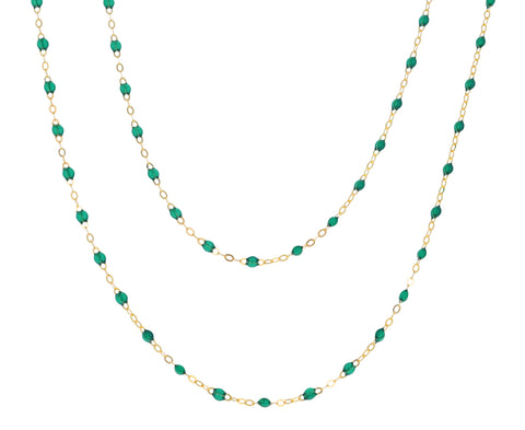 With its fluid movement and vibrant color story, this Gigi Clozeau necklace can make its way into any look you create. The emerald green resin beads are set along the 18K yellow gold chain to create the single, long strand. Alone or layered with your other favorites, it adds a modern, timeless feel to any collection.