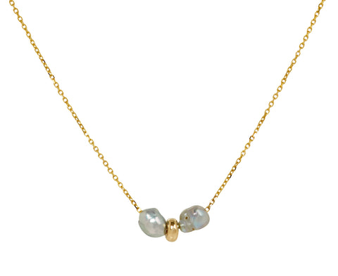 With its quiet elegance and modern design, this White/Space double pearl necklace perfectly uses classic materials to create a timeless pendant. Suspended from the center of the 14K yellow gold chain is a duo of petite luminous silver-blue pearls varying slightly in size. Wear it alone or layered with your other favorites.
