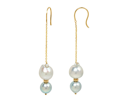 Striking in their edgy, sculptural design, wear these White/Space earrings as a stunning alternative to the traditional pearl drop earrings. The double pearls connect with a thin 14K yellow gold chain to create perfect amount of movement. They hang from 14K yellow gold ear wires.