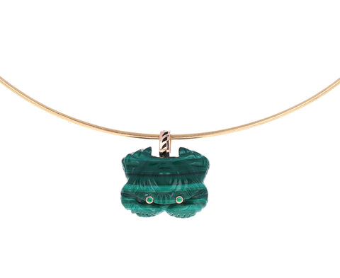With its playful, beachy vibe, this Dezso charm pendant is a piece of forest green hued malachite hand carved into the shape of a crab. It is set with emerald eyes and hangs from an enamel wave and 18K rose gold bale. Add it to any of your favorite necklaces or wear it solo for a surfer chic addition.
