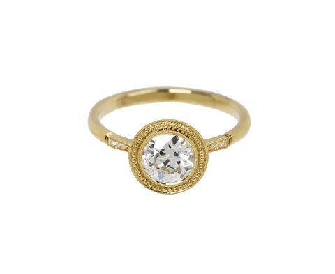 With intricate detail and a modern interpretation of a classic design, this Erika Winters diamond solitaire is the perfect way to symbolize an engagement. The round, old European cut diamond is set in a brushed bezel of 18K yellow gold with fine milgrain halo. It is centered on the tapered yellow gold band between the tiny pavé diamonds. Pair it with one of her gold bands to complete your set.