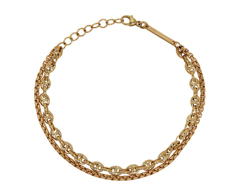 This subtle yet edgy Zoë Chicco bracelet is a modern version of the traditional gold chain bracelet. The double chain is an instant layered look with the bolder mariner link laying next to the smaller box link. They attach with a gold lobster clasp closure to create a perfect bracelet for everyday.