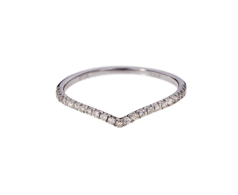 With its edgy, modern and unexpected design, this Ila Marlana boyfriend band has a cool, contemporary vibe. Alone it has a gorgeous sparkle, but you can pair stack it with one of Ila's other rings for a totally alternative wedding set. The 14K white gold band points down (or up) in the front and back and has a front surface encrusted with white diamond pavé. Styled here with the Potier, Plus One and Blair from Ila's boyfriend band collection.