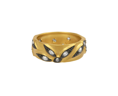 Elegant and quietly luxurious, wear this Cathy Waterman band as an earthy, understated symbol of marriage, anniversary or other significant occasion. The wide, matte 22K yellow gold band is set with marquise diamonds held in blackened 22K yellow gold milgrain bezels. This ring is a contemporary heirloom you can wear every single day.
