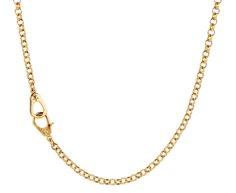 Whether worn alone or with an added pendant, this Foundrae necklace is a modern alternative to the traditional chain. The 18K yellow gold chain necklace is composed of Foundrae's signature medium belcher links. Anchoring the chain are sister hooks that perfectly fit inside each other, statement making on their own or with a Foundrae charm added!