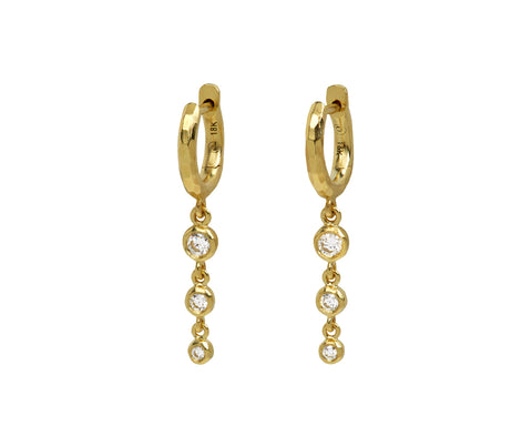 Add these shimmering Octavia Elizabeth earrings to any outfit for a hint of understated movement. The three bezel set white diamonds taper in size and hang from the polished, lightly hammered 18K yellow gold huggie hoops. They connect to 18K yellow gold latch backs.