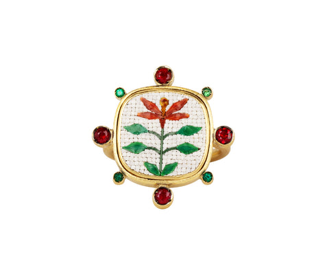 With its colorful, hand-crafted details and sweet design, this Le Sibille ring is a playful take on the traditional cocktail ring. Each of the tiny micromosaic pieces has been laid in the 18K yellow gold closed back bezel to depict a blossoming flower and bright green leaves surrounded by stark white. The composition is surrounded by complementing bezel set stones - four larger rubies and four smaller emeralds. It's set at the center of the matte 18K yellow gold band.