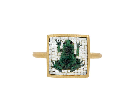Breathtaking in its intricate design and stunning details, this Le Sibille ring is an absolute work of art. The tiny micromosaic tiles have each been laid by hand in the closed back 18K yellow gold bezel to create a tiny frog surrounded by stark white for the perfect amount of contrast. It's centered on the matte 18K yellow gold band and begs for a closer look.