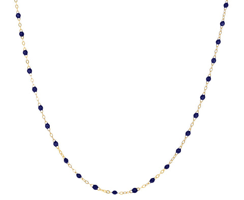 Captivating in its subtle sparkle and moody color palette, this Gigi Clozeau necklace exudes a quiet luxury. Set along the adjustable 18K yellow gold chain are tiny drops of dark, shimmering blue resin. Alone or layered with your other favorites, it adds a modern, timeless feel to any collection.