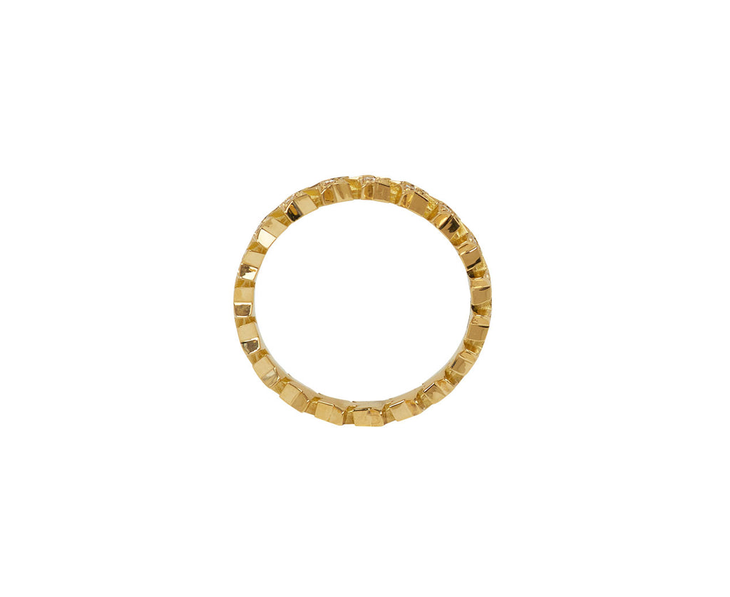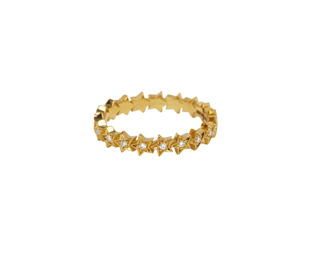 With a playful, celestial inspired design, this Hargreaves ring looks perfect whether worn alone or stacked with your other favorites. Each 18K yellow gold star connects to form the continuous design, and each star is set with a round, white diamond.