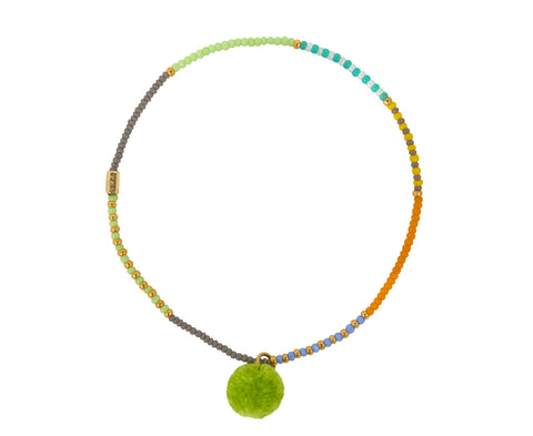 With its vibrant color palette and playful design, this Tai bracelet is a fun, fresh addition to any casual look. The colorful glass seed beads are strung along the elastic cord with a handmade neon green pom pom for added dimension. Perfect alone but even better when stacked with your other favorites.