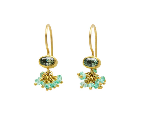 With their playful design and subtle color combination, these Mallary Marks earrings will add a perfect amount of movement to any look. The oval moss sapphire are set in 22K yellow gold bezels and anchored by a dense fringe of emerald beads. They hang from the 18K yellow gold ear wires.