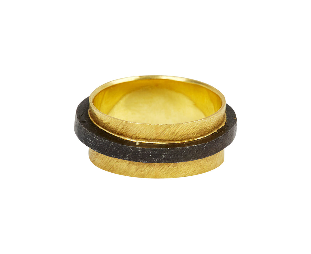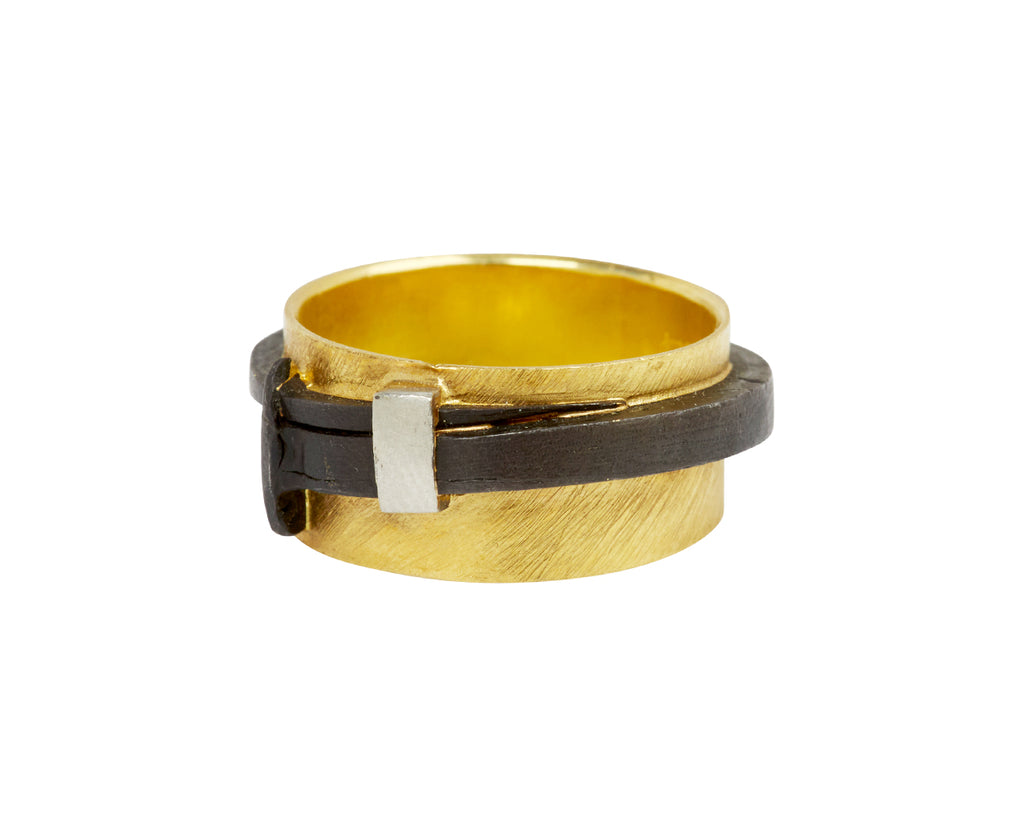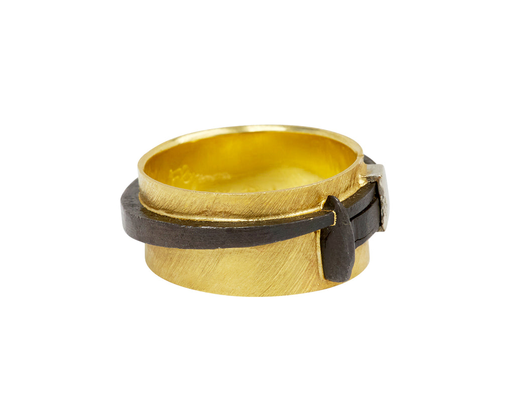 Sophisticated in its sculptural design, this ring has been meticulously hand-forged and conveys a look of striking creativity. The iron nail wraps around a thin sleeve of 18K gold with a brushed finish. A cube of platinum joins the overlap of the nail in the front of the ring. The band is 10mm wide and tapers slightly towards the back.