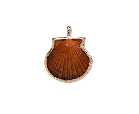 Straightforward in its minimal, earthy design, this Dezso charm pendant is a natural clam shell that is set in a heavy 18K rose gold bezel. The orange shell hangs from an enamel wave painted 18K rose gold bale. Add it to any of your favorite necklaces or wear it solo to carry a little bit of the beach with you wherever you go.