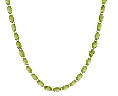This Marie-Hélène de Taillac necklace is the perfect pop of color for everyday. The faceted ovals of grass green peridot are connected by a thin ring of 20K yellow gold creating a continuous, mesmerizing strand that is finished with a 20K yellow gold spring ring clasp closure. Wear it alone or layered with your other favorites.