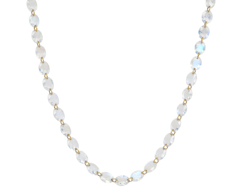 This Marie-Hélène de Taillac is the perfect combination of playful and regal. Like sparkling drops of water, the faceted rainbow moonstone ovals have a transparency that give this necklace an ethereal quality. Each of the stones is connected by a thin ring of 20K gold creating a continuous, mesmerizing strand that is finished with a 20K yellow gold spring ring clasp closure.