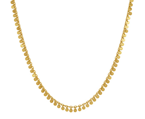 With a distinctive, bohemian vibe and earthy elegance, this Marie-Hélène de Taillac necklace is a decadent collection of tiny, 22K gold sequins. Each one dangles from a golden link of the 22K gold chain to create a lush strand which forms a fluid cascade around your neck.
