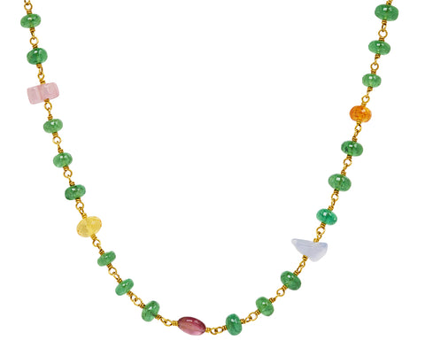 With its rich, vibrant color, this Mallary Marks necklace has an earthy elegance and surprising versatility. The strand is composed predominantly of tsavorite garnet beads broken up by South American yellow opal, pink tourmaline, tanzanite, mandarin garnet, blue chalcedony and rubellite. The variety in sizes and shapes add to the visual texture of this necklace. Each bead is meticulously wrapped in 22K yellow gold to create the continuous strand.