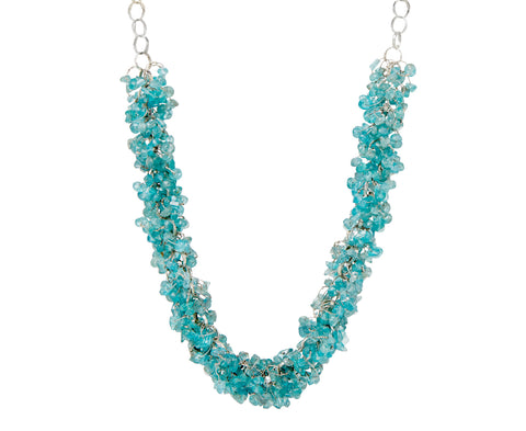 With its dramatic, earthy vibe, this Disa Allsopp necklace adds a casual, yet bold, style to any look. The round, sterling silver links connect to one another and close with a sterling silver toggle clasp. A dense cluster of assorted shaped apatite beads are set along the center of the chain for incredible sparkle and texture.