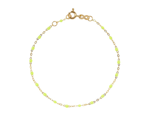 Stunning in its vibrant color, this Gigi Clozeau bracelet works with your more formal and your more casual outfits. The 18K yellow gold chain is interspersed with small bright neon lime beads. It closes with an 18K yellow gold spring ring clasp closure to create a bracelet perfect alone or layered with your other favorites.