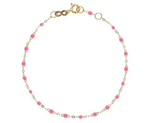 Statement making in its subtle sparkle and vibrant color, this Gigi Clozeau bracelet exudes a youthful luxury. Set along the 18K yellow gold chain are tiny drops of neon pink resin. Alone or layered with your other favorites, it's a modern way to add a pop of color to any collection.