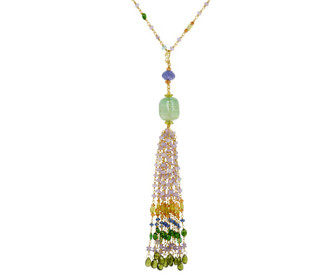 This captivating Mallary Marks necklace is a brilliant testament to her endless creativity and ability to combine colors in an unexpected manner. The long necklace is a continuous strand of mixed stones wrapped in 22K yellow gold including emerald, lavender chalcedony, mandarin garnet and yellow tourmaline. Wear at its long 32" length or wrap it around your neck twice. The brilliant, style-defining tassel hangs from a faceted tanzanite and smooth, mint green tourmaline and is anchored by a gorgeous mix of beads ending in idiocrase. Attach the style-defining tassel to the necklace to create a look of stunning sophistication or wear it without for a rich strand of color.